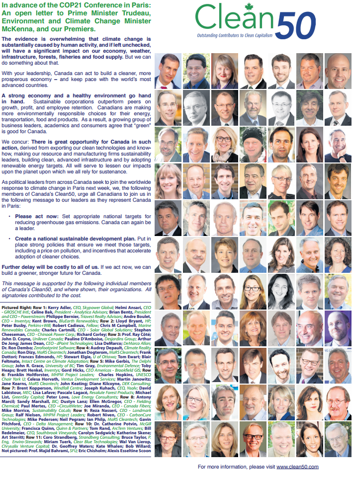 In advance of COP21, a group of recognized Canadian sustainability leaders, the Clean50, has drafted an open letter to our political leaders attending the conference, Prime Minister Justin Trudeau, Minister of Environment and Climate Change Catherine McKenna and our Premiers. The message, penned at the Clean50 Summit this past September, sends a clear message to Canada’s COP21 delegation that encourages them to take significant steps to raise Canada’s commitment to fighting climate change, and then work together to create an action plan to meet those targets.